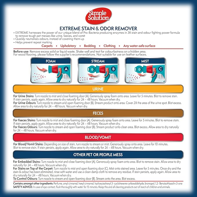 Simple Solution Extreme Pet Stain and Odor Eliminator Spray, Enzymatic Cleaner With 3X Pro-Bacteria Cleaning Power for Dogs & Cats, Strong Urine, Pee and Poop Smell Remover for Carpets & Floors, 32 oz