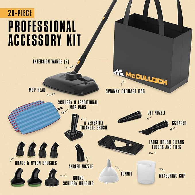 McCulloch Canister Steam Cleaner MC1375, 90 Minute Runtime, 20 Accessories, Jet Nozzle, Brushes, & More - Steam Cleaner for Home, Tile, Carpet, Furniture, & Personal Car Detailing