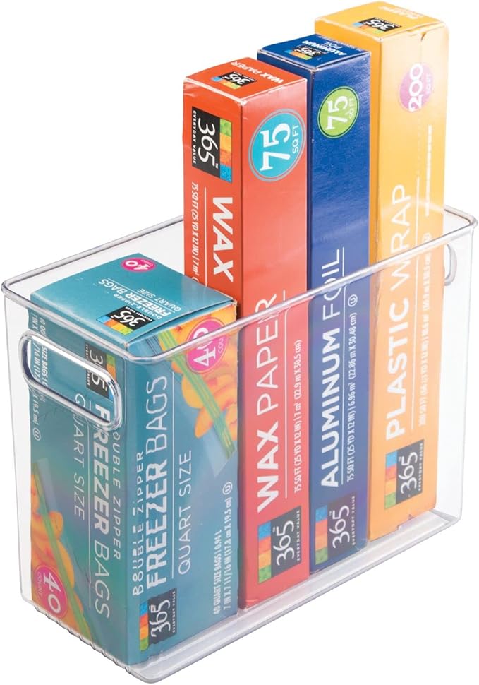 - STORAGE MADE SIMPLE: These tall bins are great for creating a clean and organized refrigerator, cabinet, or pantry; Ideal for yogurts, canned goods, food packets, cheese, meat, drink boxes, baby food, juices, boxed foods, pasta, potatoes, onions, and apples; Great for storing dry goods in the pantry; Use side by side to create the storage solution that works best for you; Maximize storage space in refrigerator, freezer, cabinets, cupboards, pantry shelves or inside drawers; Set of 2