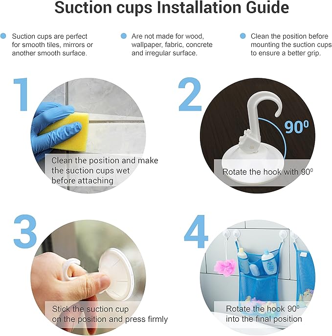 - CONCRETE SUCTION CUPS: Unlike some of the other bathroom organizer nets, we include 6 super strong suction cups instead of just 4. Our suction cups 'lock" once you move the hook down which means your bath storage net will stay stuck to the wall without constantly falling off!To ensure the BEST SUCTION possible, please just make sure the surface is FLAT and EVEN