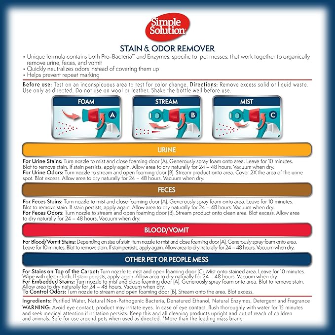 - works on water safe surfaces - safely removes pet stains and odors on carpet, upholstery, bedding, fabric toys, clothing, or other water-safe surfaces in your home.