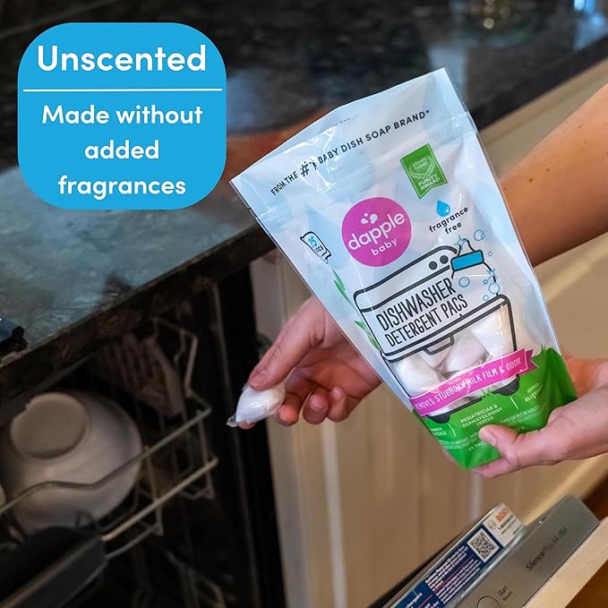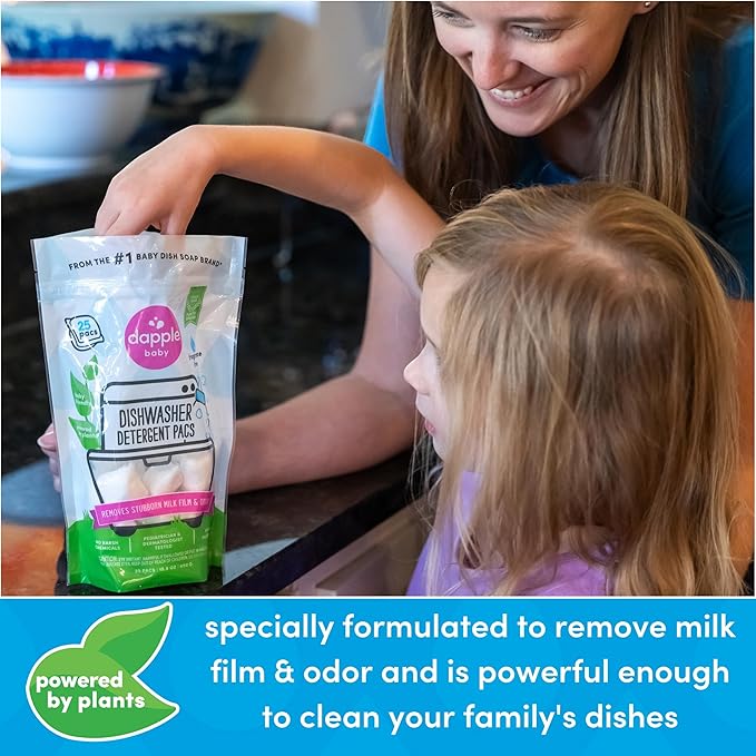 - FROM THE #1 BABY DISH SOAP BRAND*: Dapple Baby Dishwasher Detergent Pacs are baby friendly, made without harsh chemicals and powered by plants to remove stubborn milk film and odor.