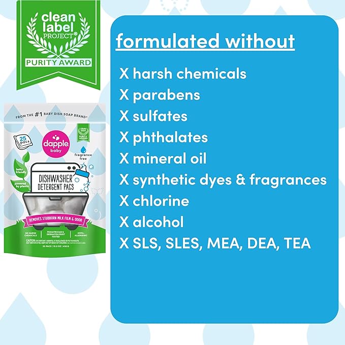 - MINDFUL INGREDIENTS: Dapple Baby Dishwasher Detergent Pacs are a Clean Label Project Purity Award Winner for clean and pure ingredients. They are pediatrician and dermatologist tested, hypoallergenic, made with plant-based ingredients and without harsh chemicals, parabens, sulfates, phthalates, mineral oil, synthetic dyes & fragrances, chlorine, alcohol, SLS, SLES, MEA, DEA, TEA.