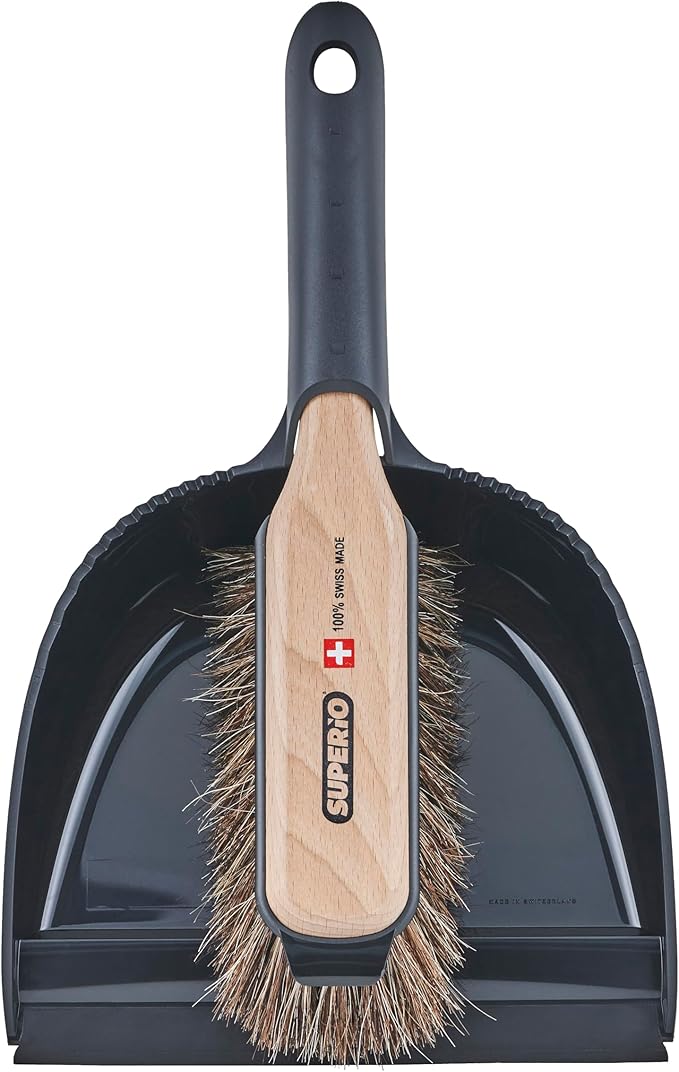 - HIGH-QUALITY MATERIALS - features high quality genuine hair from the tail and mane of horses; the strong bristles is excellent for cleaning cobwebs, for brooms, and for hand brushes high-quality horsehair - The hand brush included in this dustpan set is made of solid beechwood - Made in Swiss.