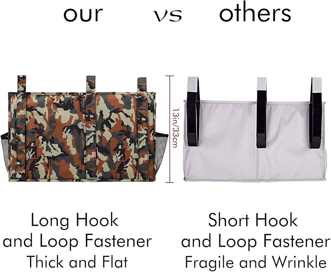 - Great Design: The hanging organizers have three adjustable heavy-duty hook and loop fastener belts that can be firmly fixed on the bed rail, and bed caddy organizers also can be hung stably on the head of the bed. The back of the bedside pocket with cardboard support is durable and can bear heavy weight. Easy to use, no assembly required.