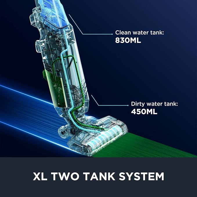 - TWO TANK SYSTEM: Clean water tank:800ml, Dirty water tank: 420ml. Eureka’s two-tank system means you are always cleaning with fresh water, while dirty water and debris are collected in a separate tank, allows for one-time cleaning of the house without changing the water during the cleaning process.