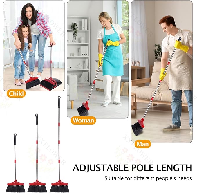 - [55.3" Long Handle Broom and Dustpan Set] Made of high-quality stainless steel poles with excellent performance in rust resistant, solid and light weight, which is easy to clean. Different people’s cleaning needs will be satisfied with the five extension poles which can be installed in different length. For example the children, adult and old man, especially for backache people, help you finish the sweeping jobs without bending.