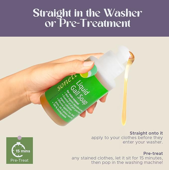 - QUICK & EASY TO USE FOR SPOTLESS CLOTHES: For best results, apply the liquid Gall soap directly on the stain and let it sit for about 15 minutes. Rinse the item well or place it immediately in the washing machine. Plus, its plant-based, skin-friendly and 100% organic synthesis makes it a great choice for baby, toddler and kid’s clothes.