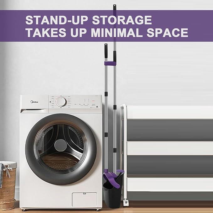 - [Enhanced Storage and Versatility] Our dustpan features a lock-in-open position, allowing for easy disposal of collected debris without any spills. The broom can be conveniently clipped to the plastic handle of the dustpan for upright storage, saving valuable space. It can be effortlessly stored in narrow gaps, such as those found between refrigerators or washing machines.