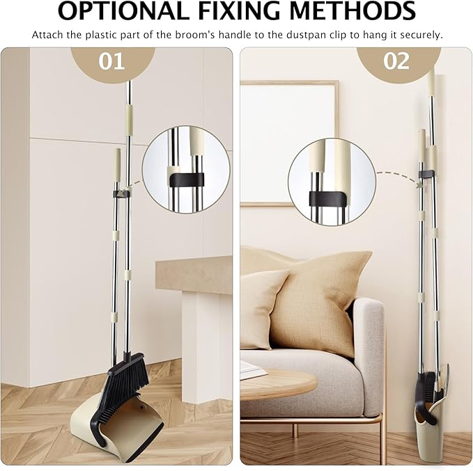 - 【EASY STORAGE】: The broom and 90° folding dustpan set features a compact design, making it convenient for storage. Simply clip the broom onto the dustpan handle and hang them together on the wall. The broom's handle can be effortlessly attached to the dustpan, effectively saving space and ensuring that they are always within reach when needed.