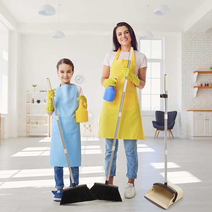 - 【STYLISH DESIGN】: The broom and dustpan set features an extended long handle and a large capacity dustpan, making it ideal for sweeping. The long handle enables you to stand upright and sweep comfortably without the need to bend down. Additionally, the set includes comb teeth that effectively remove residual hairs from the broom bristles, ensuring clean hands and protecting your back. Moreover, the set comes in a stylish color scheme, adding a touch of elegance to your daily cleaning routine.