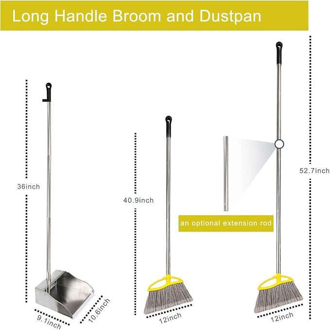 - 【Adjustable Long Handle】The heavy duty broom is adjustable with 4 stainless poles from 40.9 inches to 52.7 inches while the dustpan is 36 inches.You can adjust height of the broom according to your needs and say goodbye to aching back and knees.