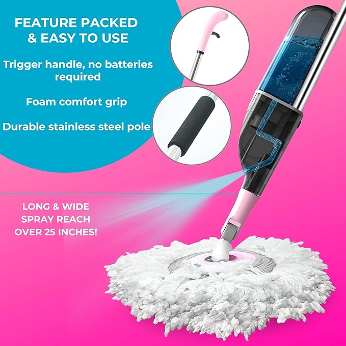 - QUALITY - Equipped with a heavy duty mop head and a stainless steel pole attached to a spray handle