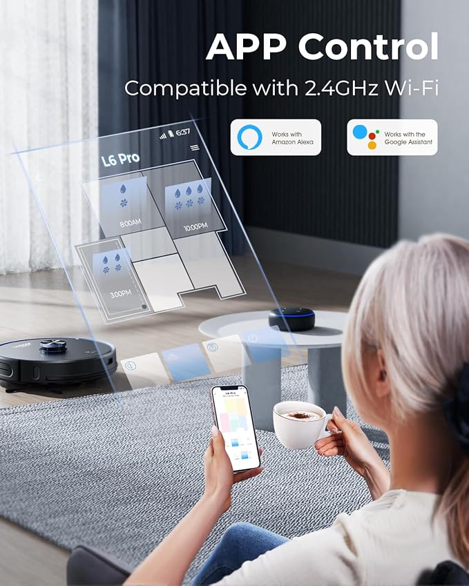 - đąăMultiple Control MethodsăThe robot vacuum and mop combo supports a variety of controls. include APP, Alexa, Google Home, so you can control the L6 Pro on/ off by voices. Only support 2.4GHz WI-FI connections.