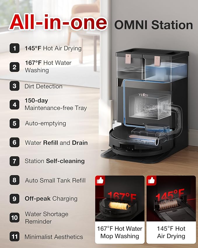 - â¨OMNI Smart StationâCleaning Maintenance Made Effortless - Let the OMNI Station handle the hard work: it washes your mop with steaming 167â water, dries it at 145â, empties dust automatically, and refills waterâso you can spend less time cleaning and more time living, with all maintenance visible and simple.