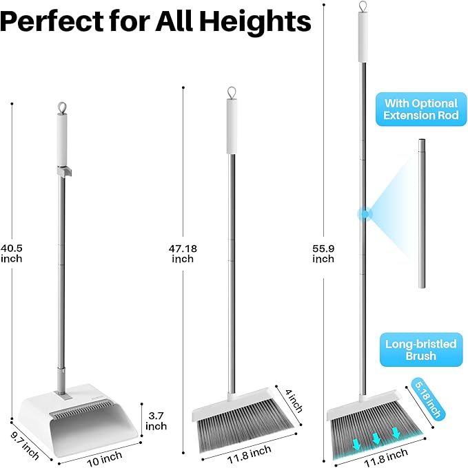 JOYMOOP 2 Pack Broom and Dustpan Set, Black and White Combo, Upright Angle with Built-in Comb Teeth for Pet Hair and Hard Floors