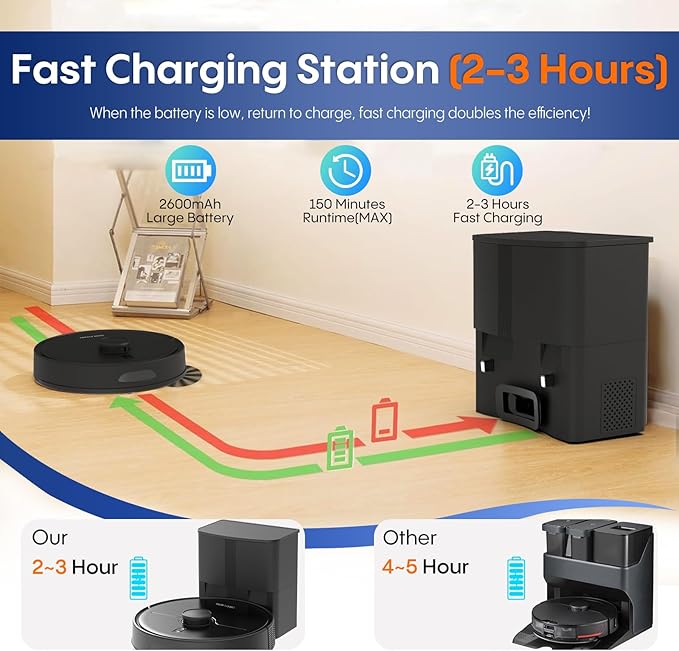- 【5000Pa Suction Power & Fast Charging】A6Pro robot vacuum and mop has 5000Pa super suction power, easily removing household debris, pet hair and deep dust on hard floors and carpets. In addition, in silent vacuuming mode, you can enjoy up to 150 minutes of continuous cleaning - perfect for large rooms, When the battery runs low, the robotic vacuums auto-recharges and continues mopping and vacuuming exactly where it left off and its charging speed is 50% faster than similar products, cleaning longer, so your floors stay clean all day long.
