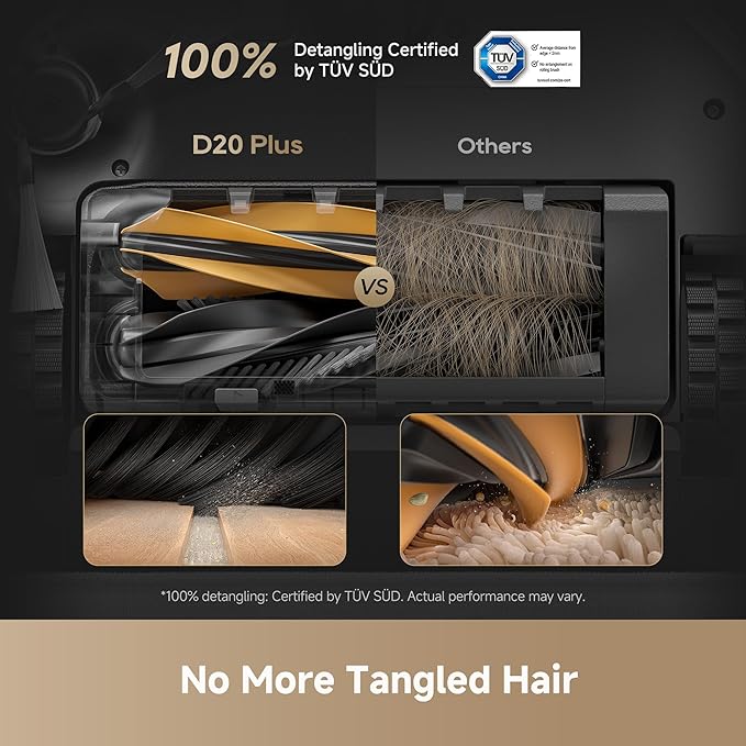 - 13,000Pa Suction + DuoBrush — Say Bye to Tangled Hair D20 Plus comes with 13,000Pa Vormax suction (yeah, that’s super strong), and its anti-tangle DuoBrush grabs long hair and pet fur like a pro—no more messy rollers to clean.