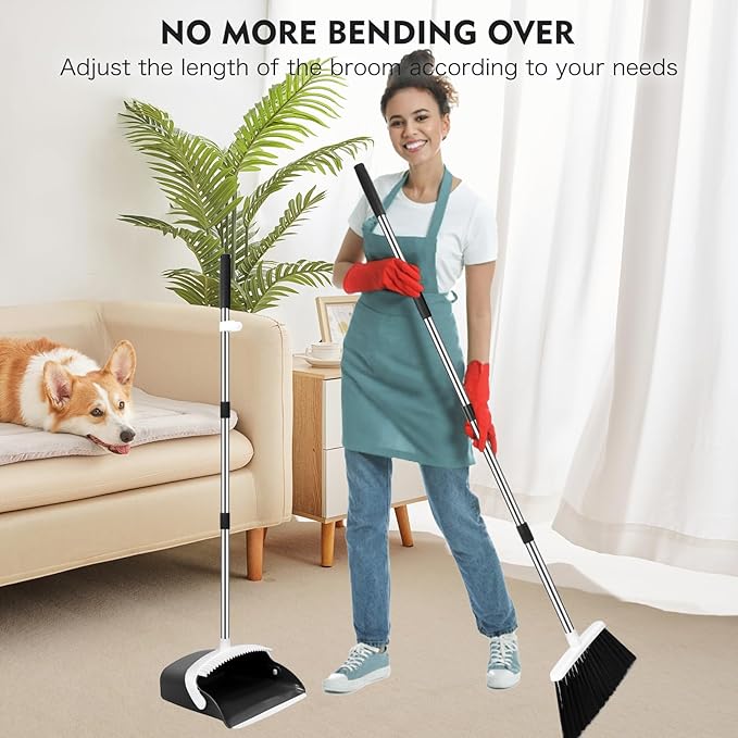 - LONG HANDLE BROOM AND DUSTPAN SET: Upgraded broom handle extends up to 55 inches, allowing you to stand up straight and sweep comfortably without bending over. Large-capacity dustpan holds a large amount of trash without leaking for efficient cleaning
