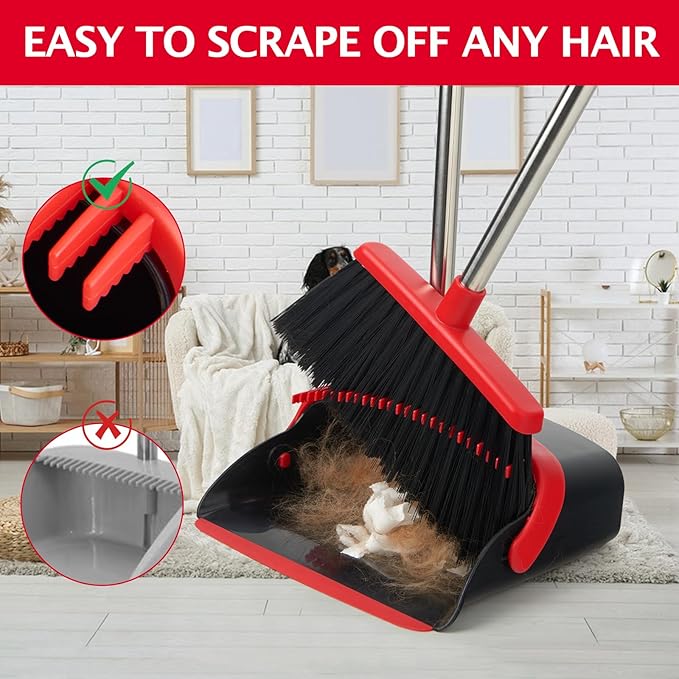 - 【Upgraded Dustpan】The newly upgraded dustpan features built-in comb teeth that make it easier to clean hair and avoid hair entanglement on the broom. The rubber lip of the dustpan is flush with the floor, soft and durable, ensuring no dust or debris is left at the bottom.