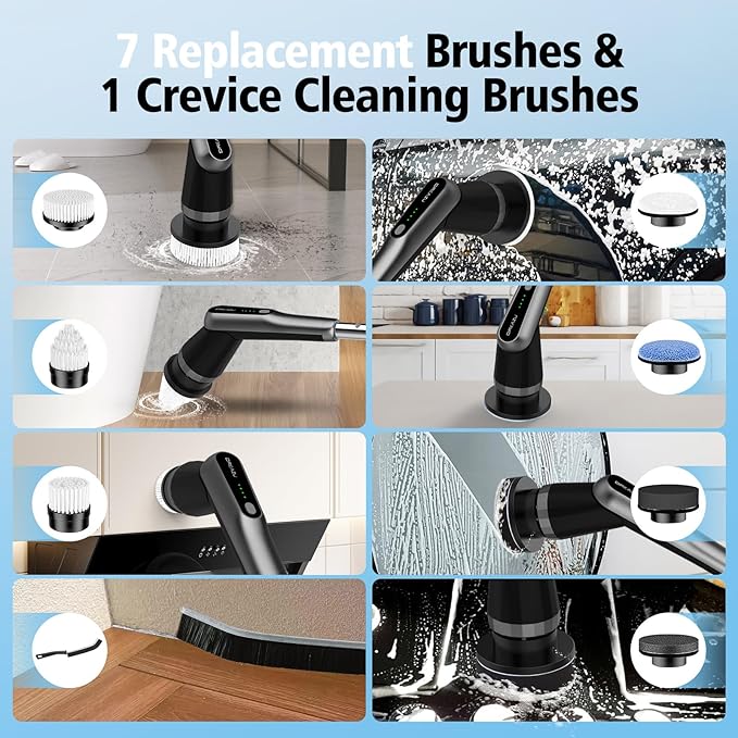 - 【10-in-1 Versatility for Every Surface】 Includes multiple interchangeable brush heads and attachments. Widely used for cleaning bathrooms, bathtubs, grills, walls, windows, dishes, sinks, corners, gaps, floors, glass, tiles, wheels, car interiors, kitchens, furniture, and stoves. This shower cleaner brush and bathroom scrubber combo meets most of your household needs.Features convenient Type-C charging (compatible with most phone/tablet adapters). Power adapter sold separately