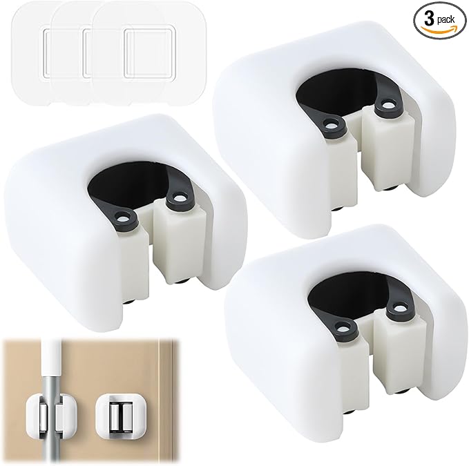 Broom Holder, Wall Mount Mop Organizer, Self-Adhesive Cleaning Supplies Hanger Rack for Bathroom Kitchen Garage Garden Space-Saving, Durable and Water-Resistant Broom Storage Solution, 3 Pack