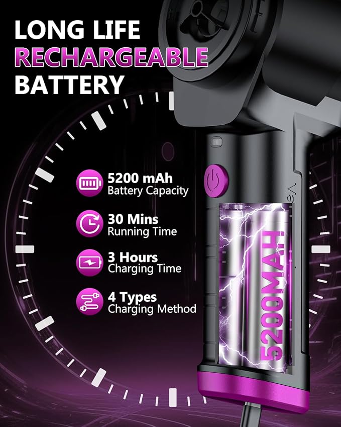- âżăType-C Fast & Safe ChargingăBuilt-in 5200mAh high-capacity battery, it charges fully in just 3 hours and offers up to 30 minutes of run time. Equipped with a Type-C cable (charger adapter not included), supports 5V-2A charger, power bank, car charging and other ways, charging at home and car at any time. Indicators light prompts real-time charging statusâred light is charging, green light is fully charged, convenient to rationalize the cleaning time