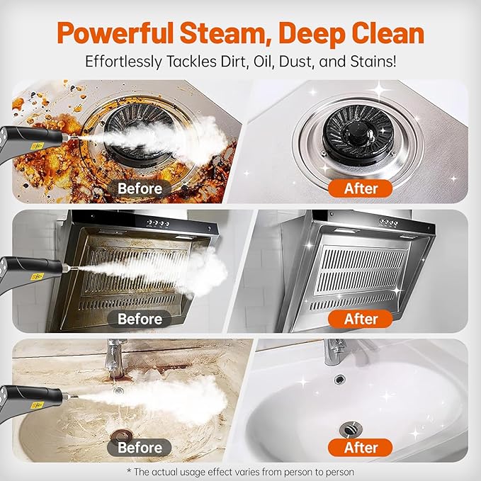 - 【Safe Design & Helpful Tips for Best Performance】Each steam cleaner is tested before shipment, so a small amount of water residue inside the hose or tank is normal and does not affect performance. The unit features an intelligent overheat protection system that monitors temperature and automatically pauses heating if needed to protect internal components. For better durability and performance, allow the machine to cool for about 5 minutes after 30 minutes of continuous use