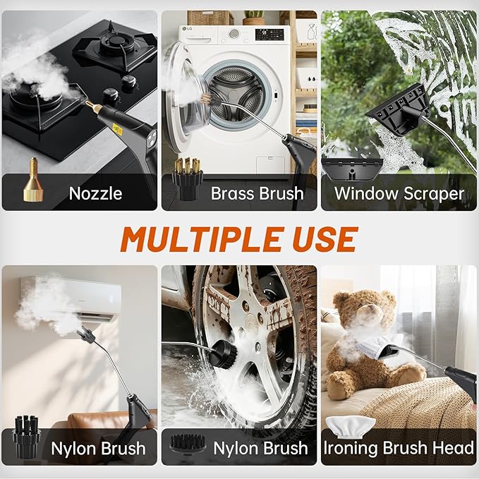- 【Multiple Accessories Set for Versatile Cleaning】This handheld steam cleaner comes with a complete accessory kit for different cleaning tasks. The package includes 1× steam cleaner with tank, 1× power cord, 1× steam pipe, 1× extension rod, 1× large plastic brush, 1× small plastic brush, 1× steel brush for stubborn grime, 1× flat brush, 1× cleaning cloth sleeve, 2× replacement gaskets, and 1× user manual. These attachments help clean tile grout, kitchen, microwave, oven, grill, bathroom, upholstery, sofa, mattress, floors, windows, furniture
