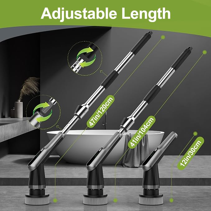 - 【Powerful & Durable Performance】 Battery and motor upgrades feature enhanced cell technology and passed a 3600-hour rotation test, ensuring stronger and longer-lasting torque. The extendable rod material and functionality have also been improved—just press to adjust the length. Now sturdier and more convenient, it’s the ideal shower scrubber with long handle.
