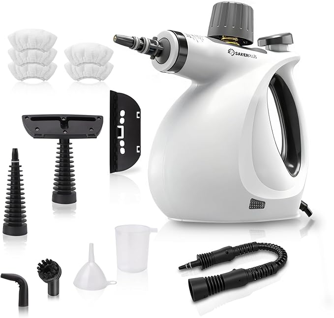 - 【9-PIECE MULTI-PURPOSE ACCESSORY SET】Sakerplus steam cleaner for furniture comes with 9 versatile attachments—nozzle head, angled nozzle head, brush head, extension hose, cloth cover, window wiper, steaming iron, funnel, and measuring cup. Designed to handle multiple cleaning tasks, it’s perfect for removing kitchen grease, tackling bathroom grout, wiping windows, refreshing upholstery, steaming clothes, and even cleaning car interiors. One steamer for your whole home.