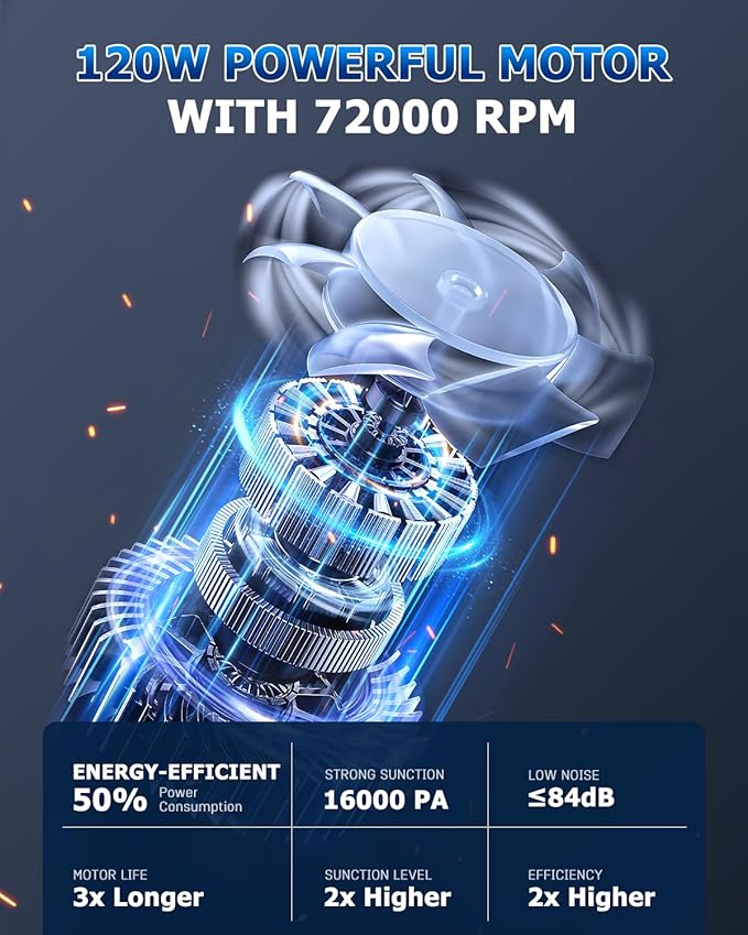 - đă16KPA POWERFUL SUCTIONăThe dust busters cordless rechargeable is equipped with a 120W high-powered motor that spins at up to 72,000RPM and provides 16,000PA powerful suction. Whether it's dust and debris on the floor or hidden dirt in narrow crevices can be quickly cleaned. Easily cope with the cleaning of home, car interior, office desktop, efficiently clean every corner, saving you precious time and energy