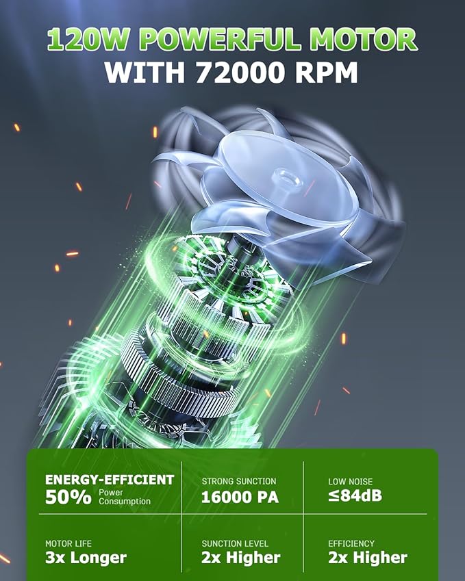 - đă16KPA POWERFUL SUCTIONăThe dust busters cordless rechargeable is equipped with a 120W high-powered motor that spins at up to 72,000RPM and provides 16,000PA powerful suction. Whether it's dust and debris on the floor or hidden dirt in narrow crevices can be quickly cleaned. Easily cope with the cleaning of home, car interior, office desktop, efficiently clean every corner, saving you precious time and energy