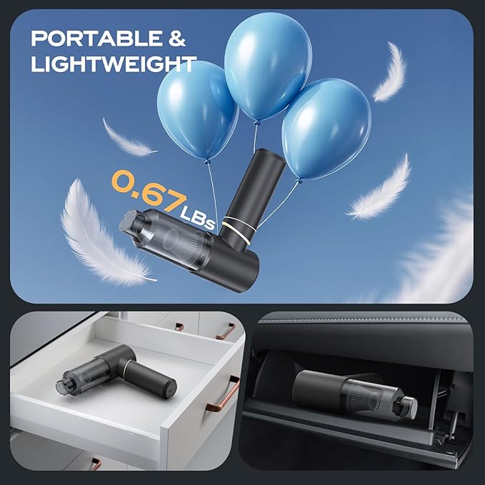 - Powerful Handheld Vacuum Cordless for Quick Cleanups – 15Kpa strong suction effortlessly lifts pet hair, crumbs, and dust from carpets, car seats, and tight spaces. The high-speed brushless motor ensures deep cleaning without losing suction over time.