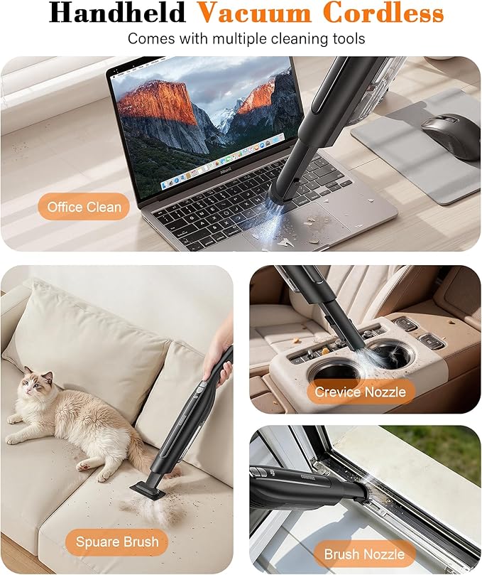 - Multi-function accessories: This hand held vacuum comes with two interchangeable brush heads and a pet brush. The crevice tool helps you easily clean hard-to-reach corners, such as sofa seams and seat gaps. The brush tool is designed for cleaning carpets, blankets, and keyboards. The pet brush effortlessly removes pet hair from beds, sofas, or carpets. The built-in LED light illuminates hidden dust in dark corners for thorough cleaning.
