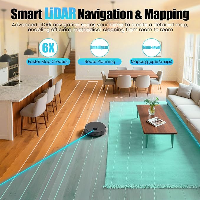 - LiDAR Navigation & Smart Mapping: The E10+ robot vacuums is equipped with an advanced LiDAR navigation system that quickly scans and accurately maps your home, enabling systematic and efficient cleaning paths for thorough whole-house coverage