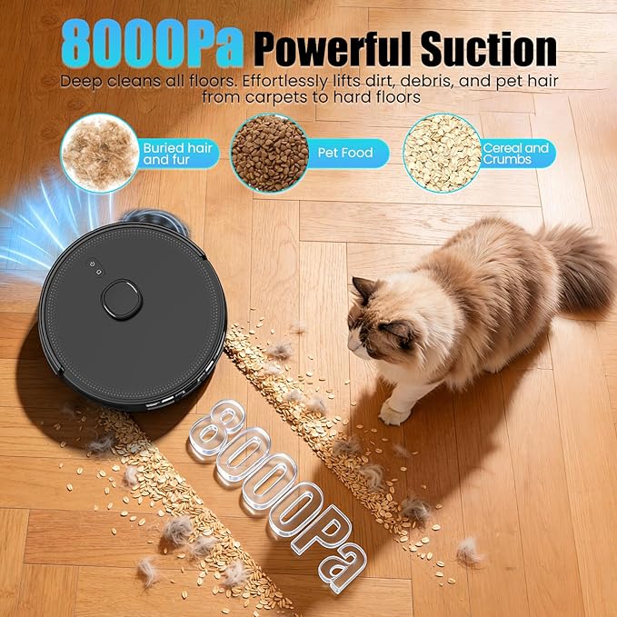 - 8000Pa Powerful Suction: The robot vacuums features 4 suction power modes with 8000Pa of powerful suction. It effortlessly removes dirt, dust, debris, pet hair, and stubborn stains from hard floors and carpets