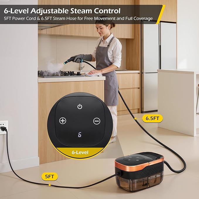 - 【6-Level Adjustable Steam】Dyna-Living multi-functional steam cleaner with 6 levels precisely adjust steam output, the automotive steamer for car detailing is easily meets a variety of cleaning needs from fabrics to stubborn oil stains. The 5ft power cord and 6.5ft steam hose allows you to easily clean larger areas without frequently moving the engine steam cleaner.