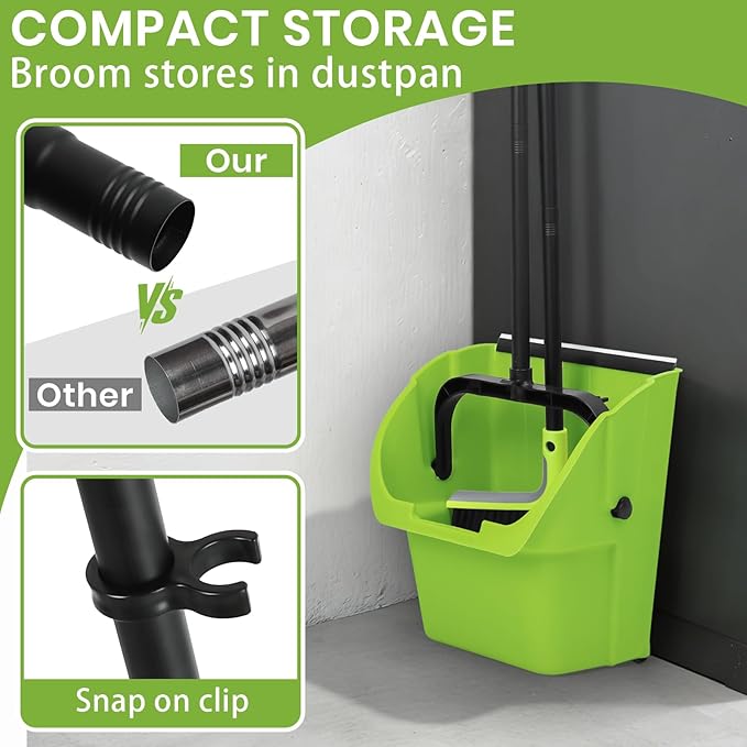 - đź’šEasy to Store- Handle swivels to sit the dust pan upright for compact storage when not in use or avoid spilling during uses. The broom snaps to dustpan for easy storage.