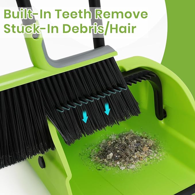 - đź’šDustpan with Comb- Integrated teeth along the top of the pan are useful for cleaning off your broom without dirty hands. Outdoor broom and dustpan set impregnates with UV protection for everyday wear and tear. This industrial dust pan has wheels for easy carrying.