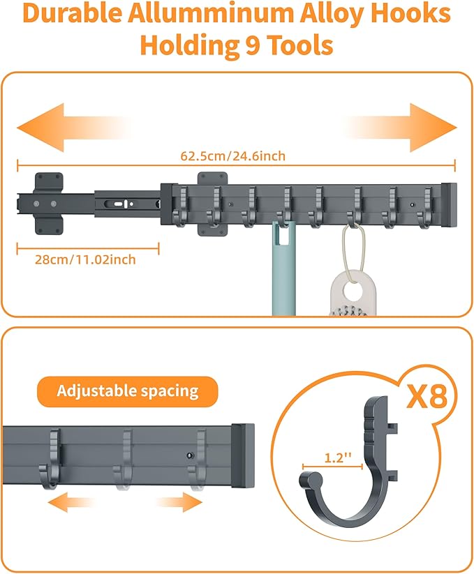 - Movable Double Row Hook Design - This broom closet features 8 solid, thickened metal hooks that are detachable, You can freely move them and adjust the spacing according to your own needs. The double-row hook design allows for the storage of more items.