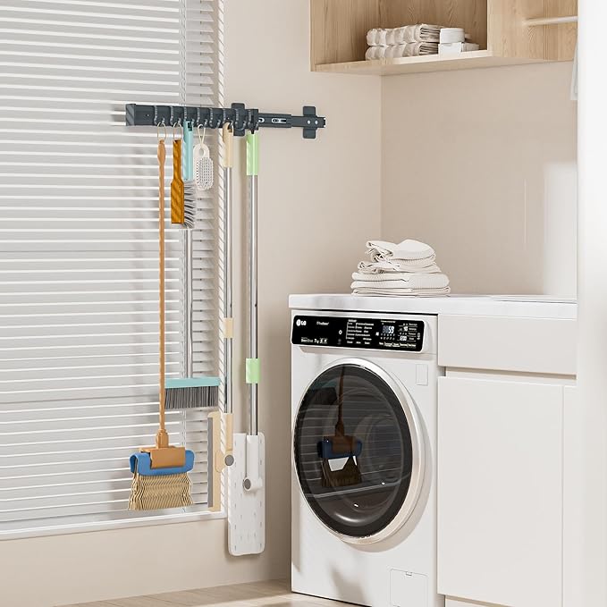 - Pull-out Mop Broom Holder - The sliding design allows you to effortlessly pull-out the hooks, customize the spacing according to your needs, and maximize the use of space. The track is very smooth, operates quietly, and does not create annoying noise. Note: Please ensure that the inner depth of your cabinet is large than 14.2''.