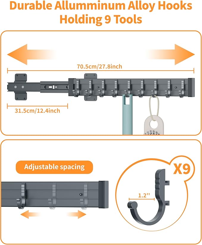 - Movable Hook Design - This broom closet features 9 solid, thickened metal hooks that are detachable, You can freely move them and adjust the spacing according to your own needs. move hook design allows for the storage of more items.