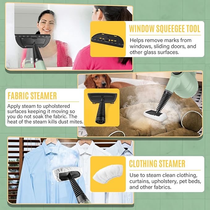 - MULTI-PURPOSE STEAM CLEANER FOR WHOLE-HOME USE: Instead of buying different tools for every job, this steam cleaner handles messes around sinks, stovetops, countertops, tiles, grout, toilets, shower curtains, windows, pet areas, car seats and rims, grills, mattresses and bedding. One compact steamer lets you move from room to room without changing machines.