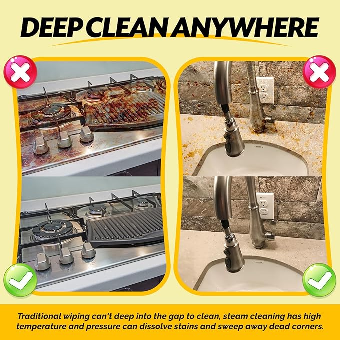- DEEP CLEANING WITH LESS SCRUBBING: This handheld steam cleaner uses 1050W of high-pressure steam (up to 221°F) to loosen kitchen grease, soap scum and everyday grime so you don’t have to scrub as hard. It’s ideal if you want your kitchen and bathroom to look deep cleaned without spending your whole day cleaning.