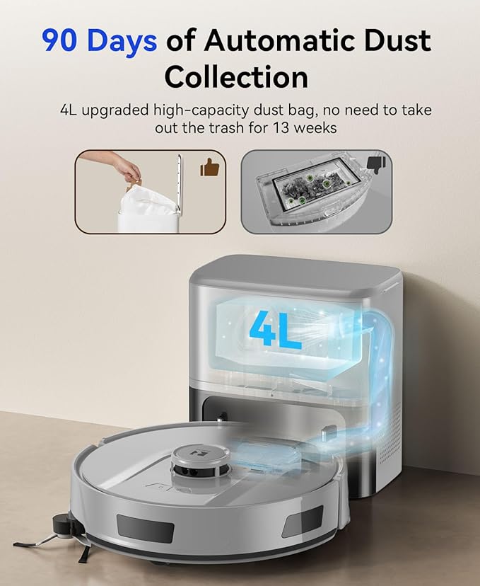 - ใ๐ญ๐ด๐ฌ-๐๐ฎ๐ ๐๐ฎ๐๐๐น๐ฒ-๐๐ฟ๐ฒ๐ฒ ๐๐๐๐ผ ๐๐๐๐ ๐๐ผ๐น๐น๐ฒ๐ฐ๐๐ถ๐ผ๐ปใ-This robot vacuums and mop enjoy up to 90 days of hands-free cleaning with a 4L extra-large dust bag. the package includes two dust bags, providing 180 days of dust collection.the powerful suction vacuum base station efficiently empties the collected dirt and debris into the dust bag, ensuring uninterrupted cleaning sessions. no daily messy cleanup or allergen exposure, just enjoy your time for fun