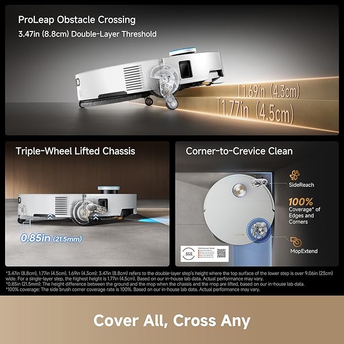 - Clear Obstacles, Hug Edges: X60 Ultra intelligently detects steps up to 3.15in (8cm) and utilizes optimal strategies for safe and smooth navigation. With its MopExtend RoboSwing, it effortlessly reaches into corners and beneath furniture, while SideReach effectively cleans along edges and tackles tight spots