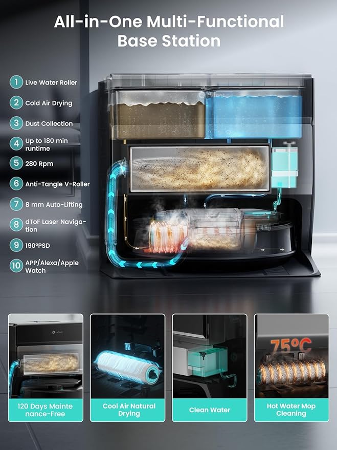 - 【Intelligent Cleaning, Freeing Hands】Completely revolutionizing hands-free cleaning, the M5 Pro features a full-featured self-cleaning system that automatically empties dust into a dust bag with a 120-day capacity. 167F hot water auto cleans the roller mop, It cleans itself while mopping the floor. and uses cold air drying(App-selectable drying time) to prevent odors and protect the mop. Auto wastewater discharge and automatic water replenishment. uninterrupted mopping the floor across 1937 square feet of land, furthermore, this robot vacuum cleaner boasts a battery life of up to 180 min–making it ideal for large homes.