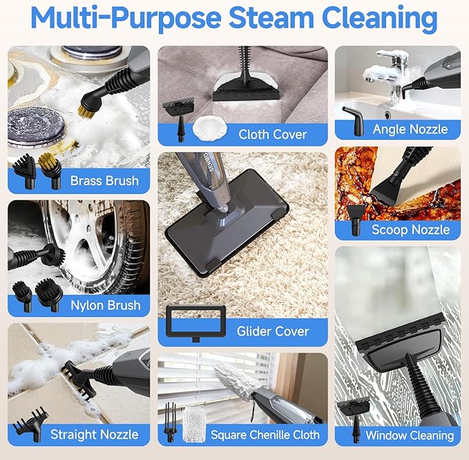 - 【14-in-1 Multi-Function Handheld Steam Cleaner】 This versatile steam cleaner for floors includes a range of attachments for every cleaning need. Equipped with nylon brushes, a stainless steel brush, gap cleaner, triangular brush, multiple nozzles, and a glass window cleaner, it tackles everything from kitchen to bathroom grease. Use the microfiber cloths for floors, carpets, furniture, tiles, windows, upholstery, or even to steam curtains and freshen up pet areas—no surface is left behind